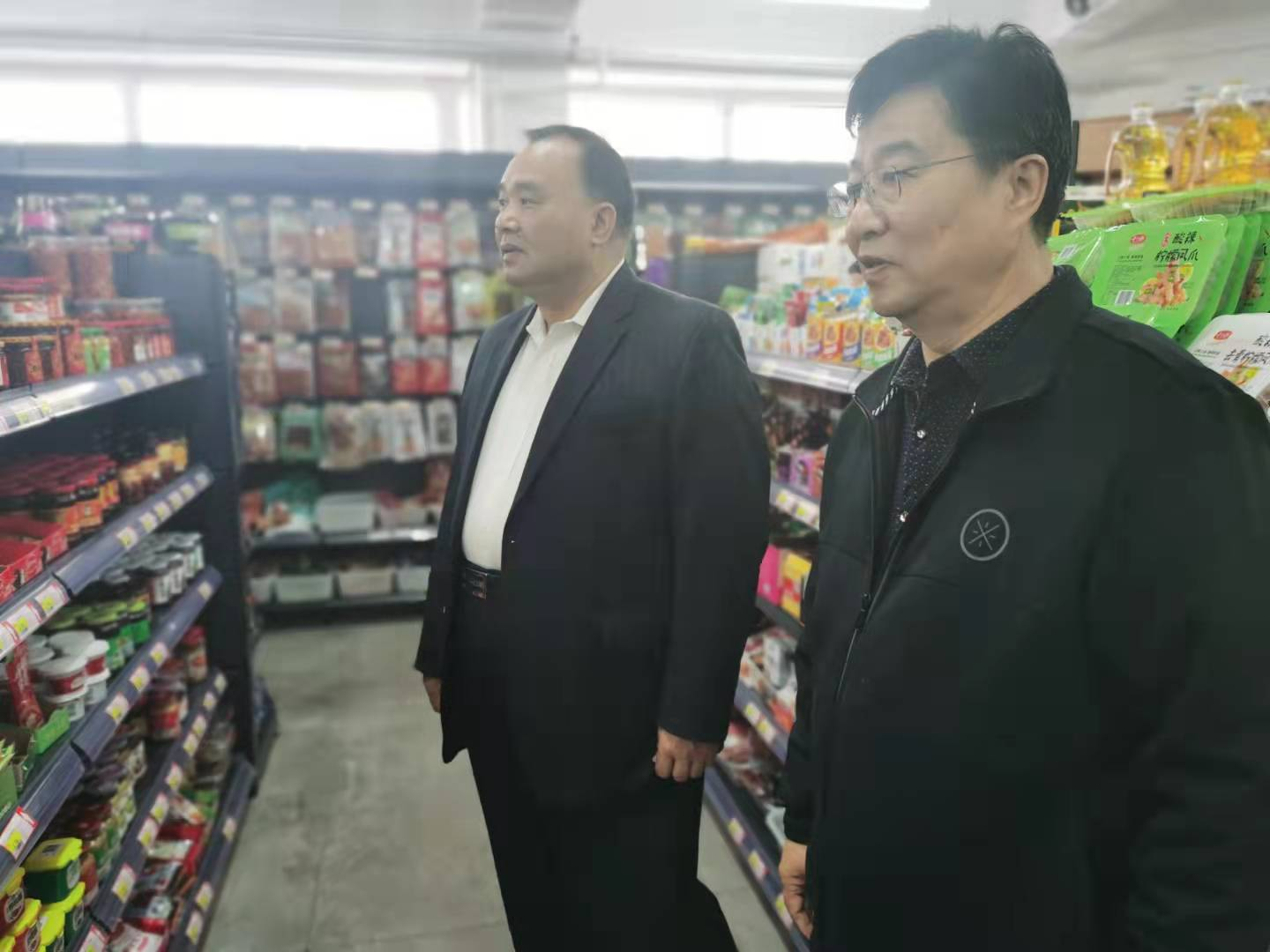 在海滨超市,薛董事长认真查看了各类商品的供应情况,重点了解了水果、副食品等供应、价格及销售情况,并询问了各类商品的货源组织、货源储备及市场价格和超市运营情况。