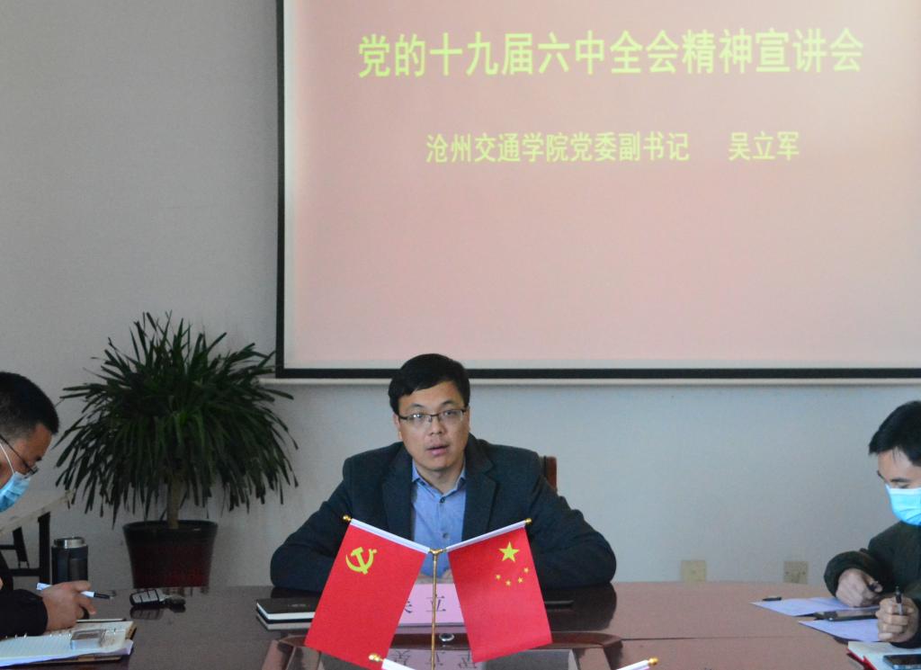 为认真学习宣传贯彻党的十九届六中全会精神,切实把全校师生的思想和行动统一到全会精神上来,12月13日上午9点,德赢官网在大学生活动中心206组织开展党的十九届六中全会精神宣讲会。党委副书记吴立军担任主讲人。
