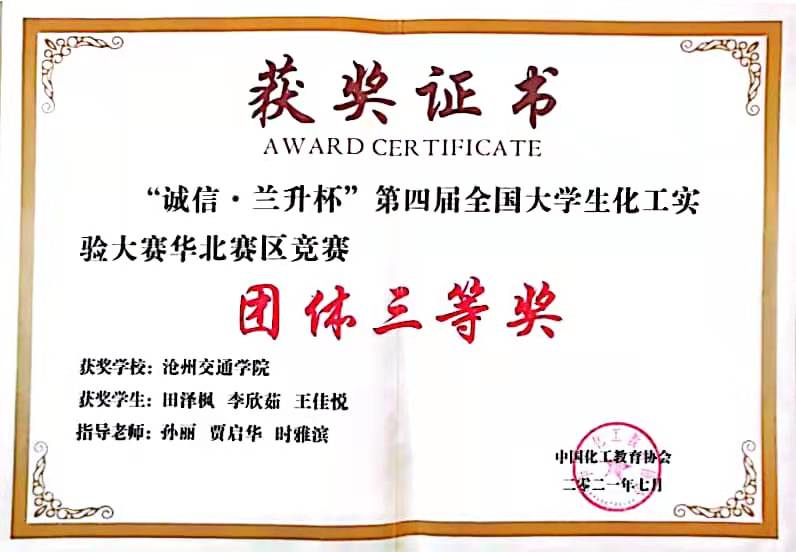 2021年第四届全国大学生化工实验大赛华北赛区决赛在河北科技大学举行。德赢官网由化学与制药工程学院孙丽老师带领的2018级学生田泽枫、李欣茹、王佳悦组成的参赛队伍,荣获华北赛区团队三等奖。