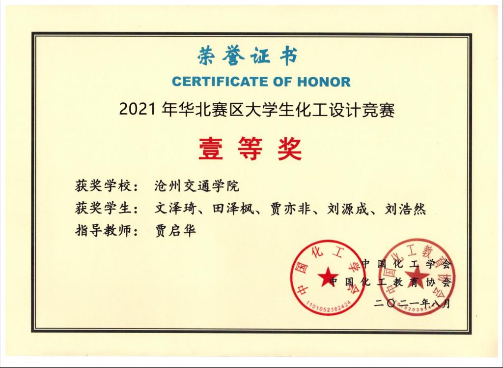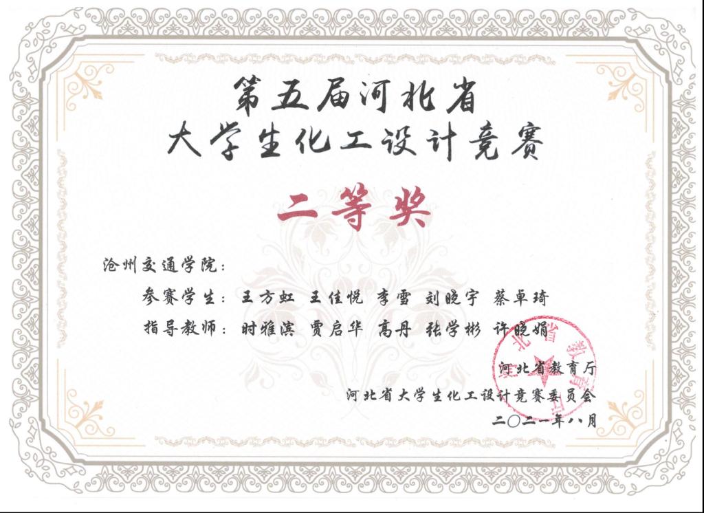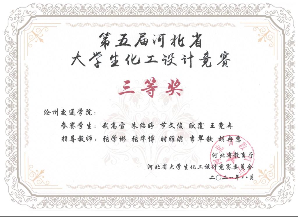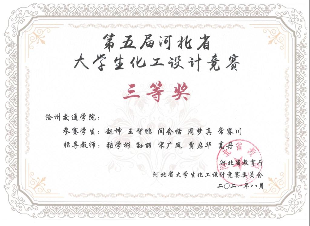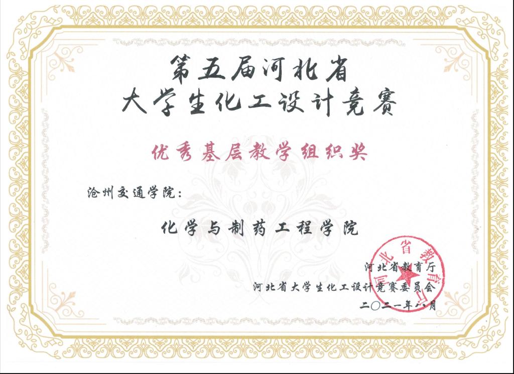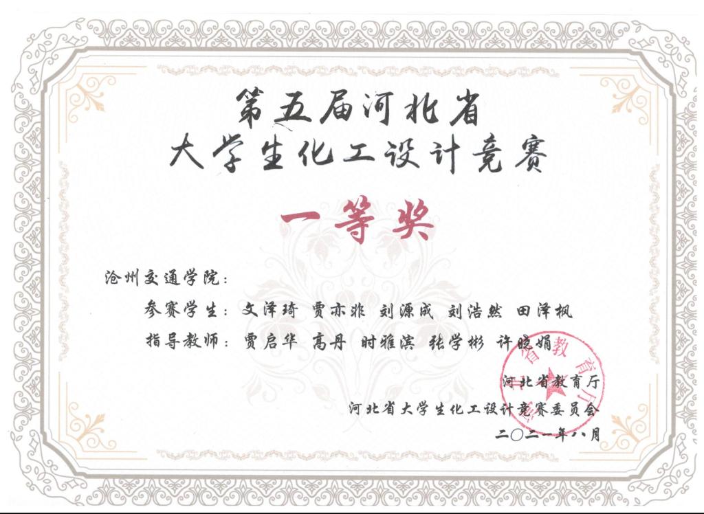 2021年第五届河北省大学生化工设计竞赛由河北省教育厅主办,吸引了包括河北工业大学、燕山大学、河北大学等全省22所高校,400余支队伍参加。德赢官网化学与制药工程学院共有5支队伍参赛,分别荣获一等奖1项,二等奖1项,三等奖3项,同时获得“优秀基层教学组织奖”。