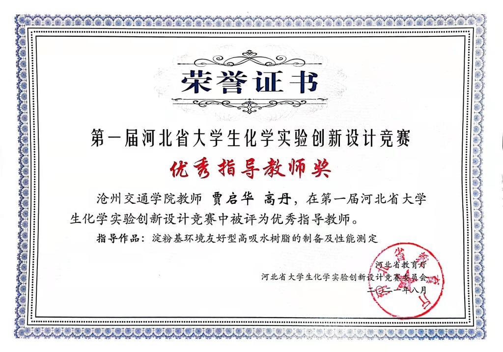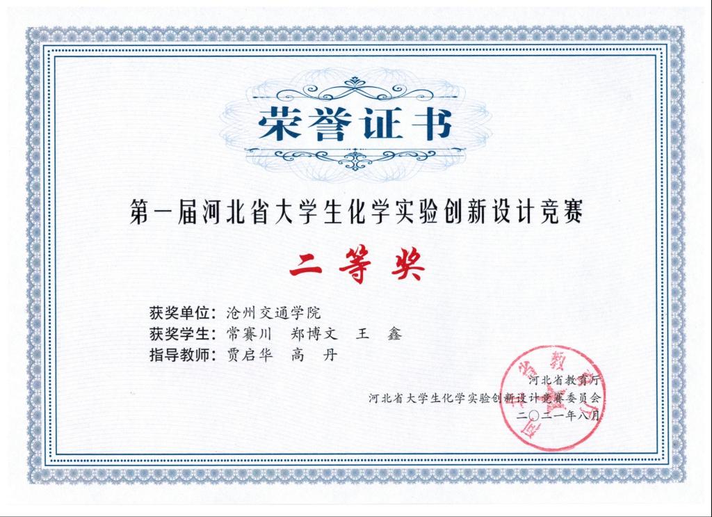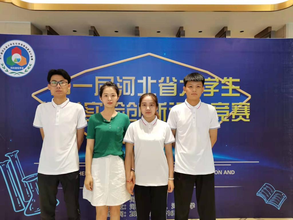 2021年第一届河北省大学生化学实验创新设计竞赛由河北省教育厅主办,河北大学与河北省化学会共同承办,旨在全面提升我省化学类专业大学生的创新意识、创新思维和创新能力。德赢官网由贾启华、高丹老师指导,2019级化工专业本科生常赛川、郑博文、王鑫同学组成的“三只小熊队”经过比赛的激烈角逐,荣获竞赛二等奖,同时德赢官网教师贾启华和高丹在本次竞赛中获评“优秀指导教师奖”。