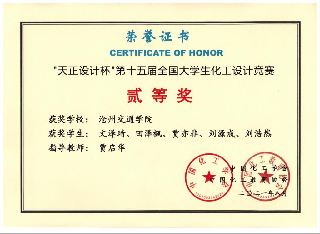 全国大学生化工设计竞赛由中国化工学会、中国化工教育协会主办,是国内化工类级别最高、参赛队伍最多、影响最大的比赛。在第十五届全国大学生化工设计竞赛中,由德赢官网化学与制药工程学院贾启华老师指导,文泽琦、田泽枫、贾亦非、刘源成、刘浩然五位同学组成的“好想和您凑一队”参赛队伍荣获国赛二等奖,华北赛区一等奖。