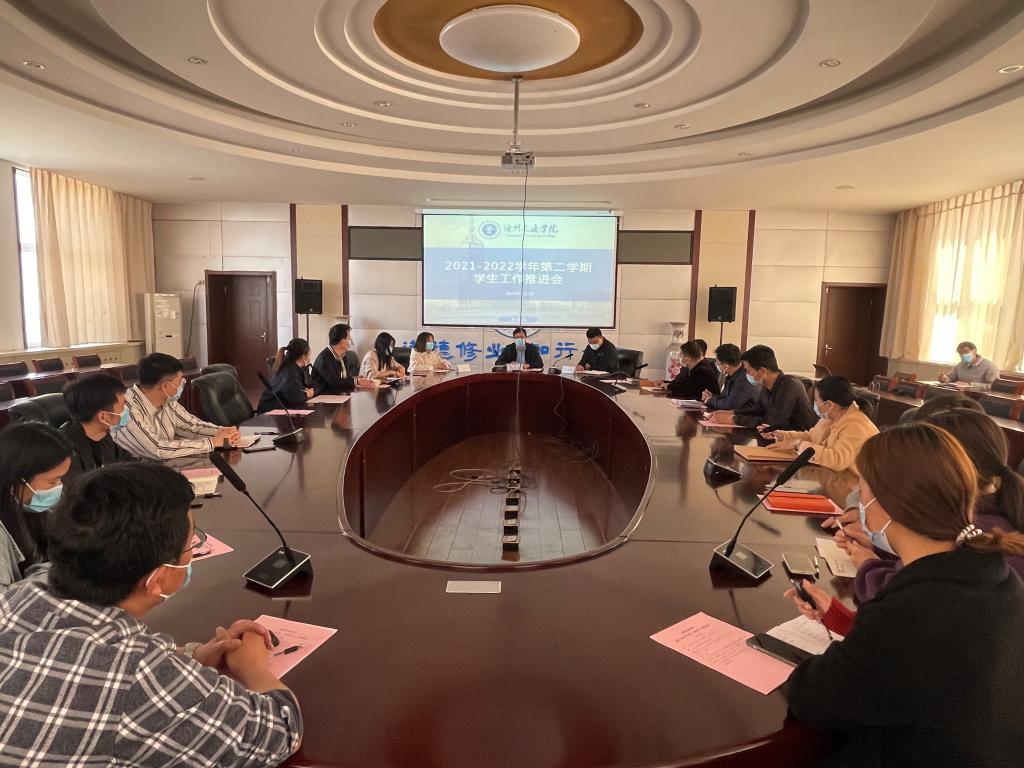 2022年4月5日上午10:00,德赢官网在行政楼B512会议室召开2021-2022学年第二学期学生工作推进会,党委副书记吴立军出席会议,学生处负责人、各学院主管副院长、团委书记及学生处全体老师参加本次会议。本次会议采取线上与线下相结合的方式,会议由学生处处长王庆松主持。