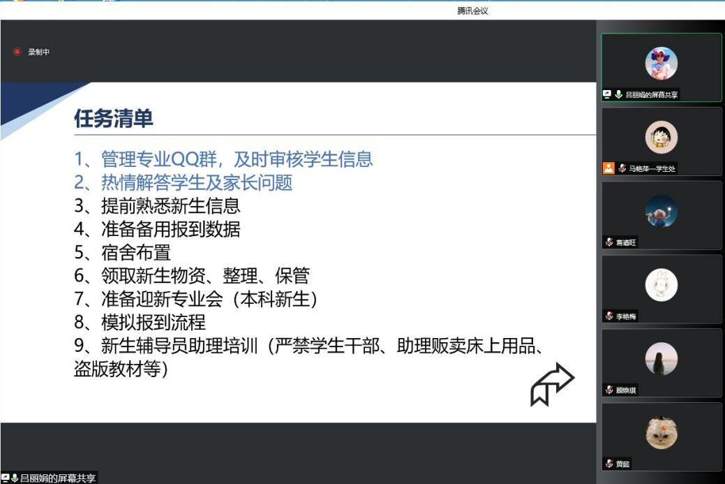 本次会议旨在提升新生辅导员的业务知识与实操能力,培训的内容主要包括招生宣传政策、新生报到流程、新生报到防疫工作方案和2021级辅导员经验分享四个主题。