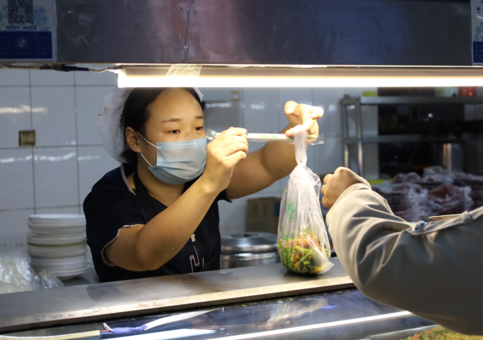 洗菜、做菜、售出……机械化不停歇的工作和食堂闷热的环境并没有阻挡食堂阿姨对工作的热情,哪怕不能摘的口罩令她脸上全是水雾,她也笑意盈盈地面对每一个背井离乡的小顾客。“我觉得忙点也没什么,我就是想尽自己最大的努力,让同学们在学校吃好喝好,我就挺满足的了。”