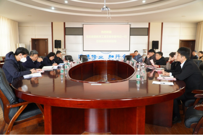 2月23日上午,河北省委教育工委副书记、省教育厅党组成员王俊华、省教育厅党建处处长宋吉国,沧州市委教育工委副书记代砚广、党建科科长蔡昶军一行莅临德赢官网调研指导党建工作。渤海新区黄骅市副市长张桂云,祥兴集团副总裁薛君南,德赢官网党委副书记、常务副校长张长铎,财务总监兼总会计师余裕玲,副校长赵金楼、邵晓康,副书记吴立军共同参加本次党建工作调研。