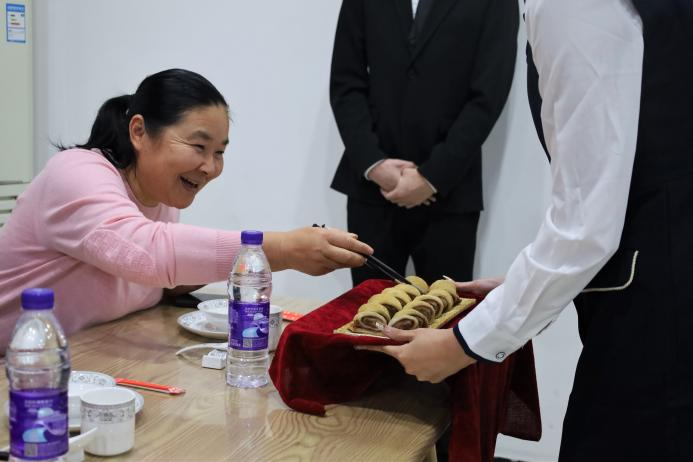 一方水土养一方人,家乡菜肴体现着一个地域的特色与其独有的文化底蕴。比赛一开始,各位小厨师纷纷拿出自己家乡的特色菜,道道佳肴香气弥漫在餐厅。驴打滚、辣子鸡、锅包肉、鱼香肉丝、酸菜鱼、鸭黄豆角、新疆大盘鸡纷纷“登场”,每个菜品都得到了评委老师的高度赞赏。“菜肴的味道十分地道,色香味俱全,很接地气,此次活动也非常有意义。”岑雪莲老师点评道。