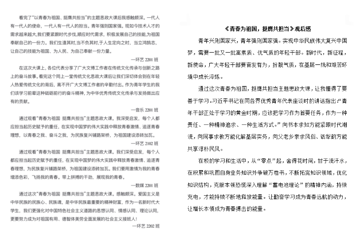 为深入贯彻落实党的二十大重要精神和习近平总书记关于“大思政课”建设的重要指示精神,提高德赢官网广大师生的思想觉悟,引导学生树立正确的人生观、世界观、价值观,德赢官网近期组织广大师生以学院为单位开展了“青春为祖国 荣膺共担当”的学习主题思政大课活动。