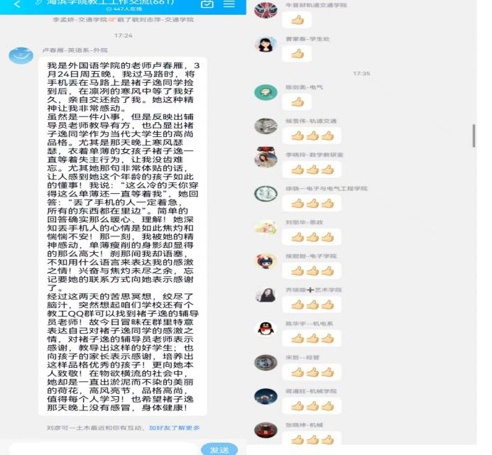 失主卢春雁老师在学校的教工QQ群里发表长文向褚子逸同学表示感谢,其他老师在看到后对褚子逸同学这一拾金不昧的行为纷纷点赞。