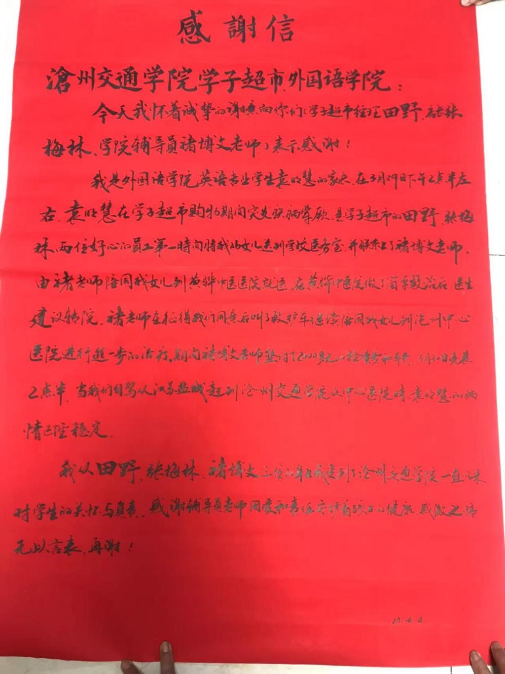 3月29日下午外国语学院袁明慧同学在学子超市购物时突然晕厥,学子超市店长张梅林和经理田野立即将袁明慧同学送到校医务室并联系上辅导员褚博文。褚博文老师在接到信息的第一时间,就陪同其到黄骅中医院。经过检查,中医院医生建议转院,辅导员在征得家长的同意之后,陪袁明慧同学坐救护车到沧州中心医院,到家长凌晨2:30赶到时,袁明慧同学的病情已经稳定好转。