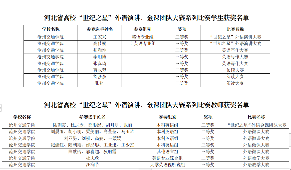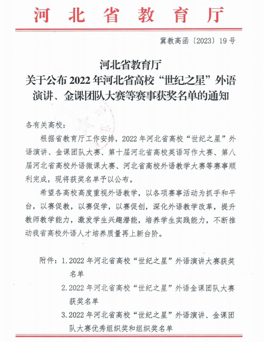 近日,河北省教育厅发布了《河北省教育厅关于公布2022年河北省高校“世纪之星”外语演讲、金课团队大赛等获奖名单的通知》(冀教高函〔2023〕19号),此系列比赛中,德赢官网外国语学院多名师生共获奖15项。