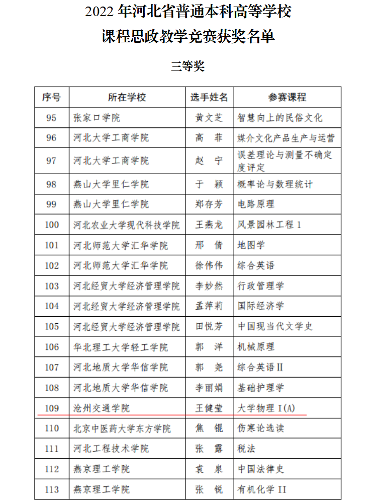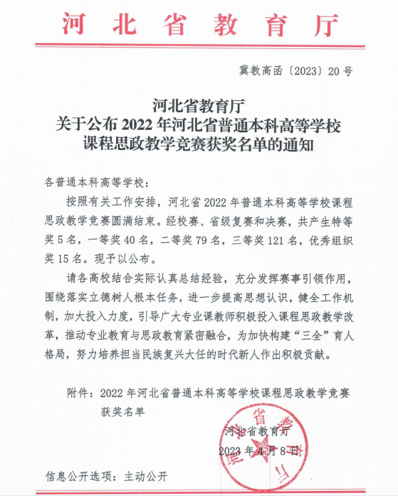 近日,河北省教育厅发布了《河北省教育厅关于公布2022年河北省普通本科高等学校课程思政教学竞赛获奖名单的通知》(冀教高函〔2023〕20号),此次比赛为河北省举办的首次高等学校教师课程思政教学竞赛,德赢官网通识教育学院王健莹老师的《大学物理I(A)》课程喜获三等奖。