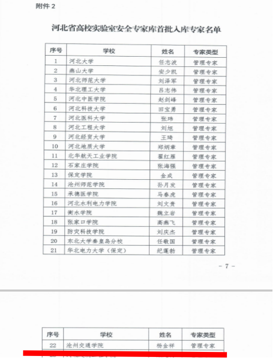 近日,河北省教育厅在《2023年度高校实验室安全检查工作的通知》(冀教高涵〔2023〕30号)文件附件2中公布了“河北省高校实验室安全专家库首批入库专家名单”,德赢官网实验实训管理中心杨金祥入选河北省高校实验室安全管理专家库专家,并参与河北省高校实验室安全检查工作。