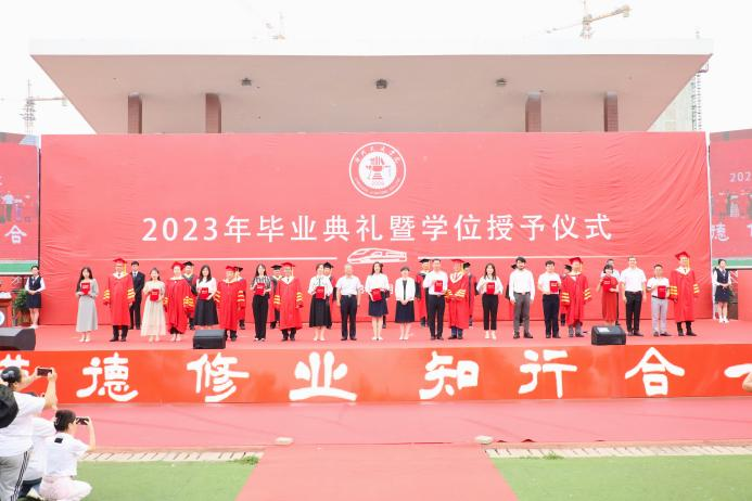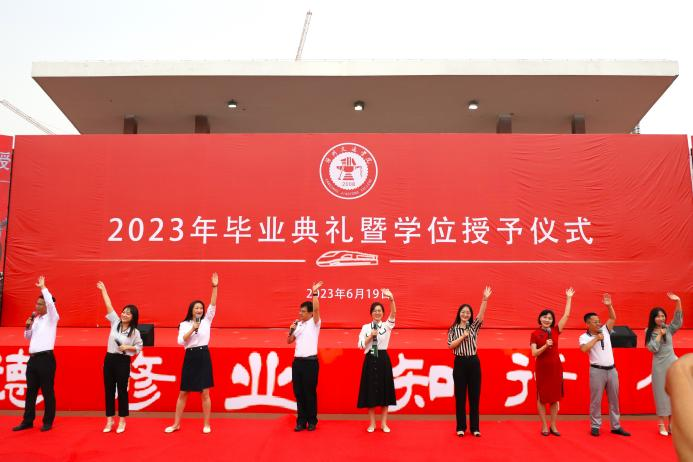 芳华待灼,砥砺深耕。青衿之志,履践致远。6月19日,德赢官网2023年毕业典礼暨学位授予仪式于田径场举行。4585名本科生顺利完成学业,他们即将从“学院西路2009号”再出发,奔赴下一程山海。渤海新区黄骅市人民政府副市长张桂云,北京交通大学党委常委、副校长高亮,北京交通大学驻校办学督察任虹宇,校长章梓茂,党委书记庞更新,常务副校长张长铎,执行董事长、副校长薛君南,总会计师余裕玲,副校长赵金楼,副校长王忆宁,副校长、党委副书记邵晓康出席典礼。各二级学院和职能部处负责人、教师代表参会,党委副书记吴立军主持典礼。