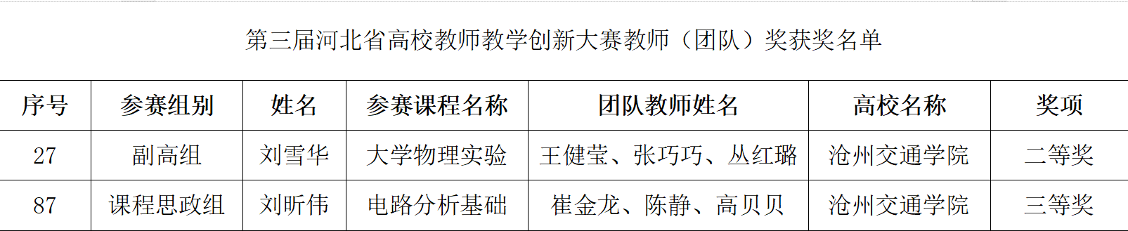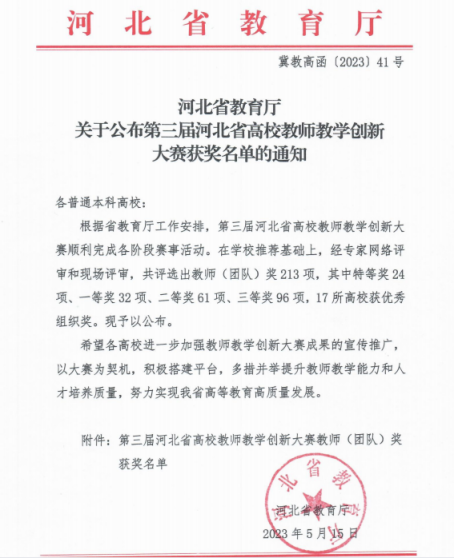 近日,河北省教育厅发布了《关于公布第三届河北省高校教师教学创新大赛获奖名单的通知》(冀教高函〔2023〕41号),此次比赛中德赢官网教师获得喜人成绩。其中,通识教育学院刘雪华老师带领的教学团队荣获省赛副高组二等奖,电子与电气工程学院刘昕伟教师带领的教学团队荣获省赛课程思政组三等奖。