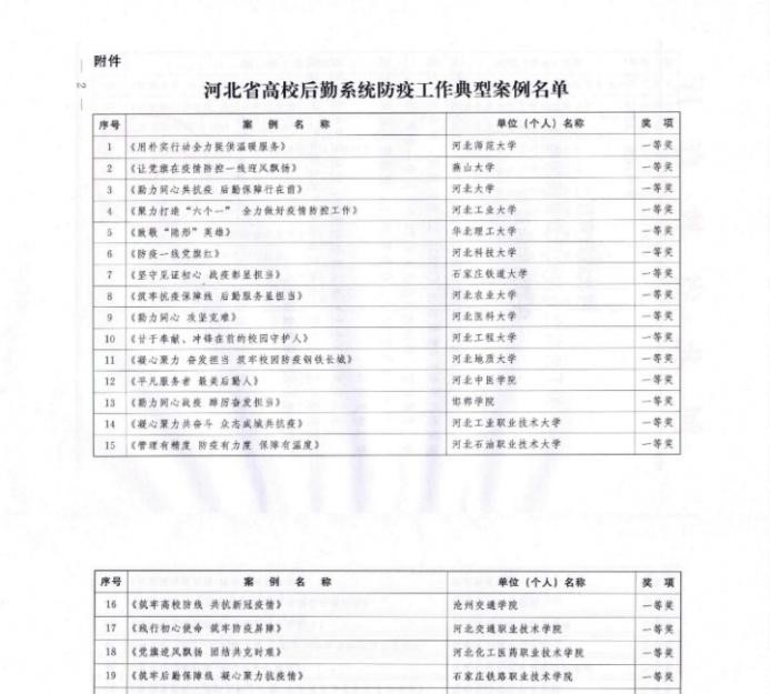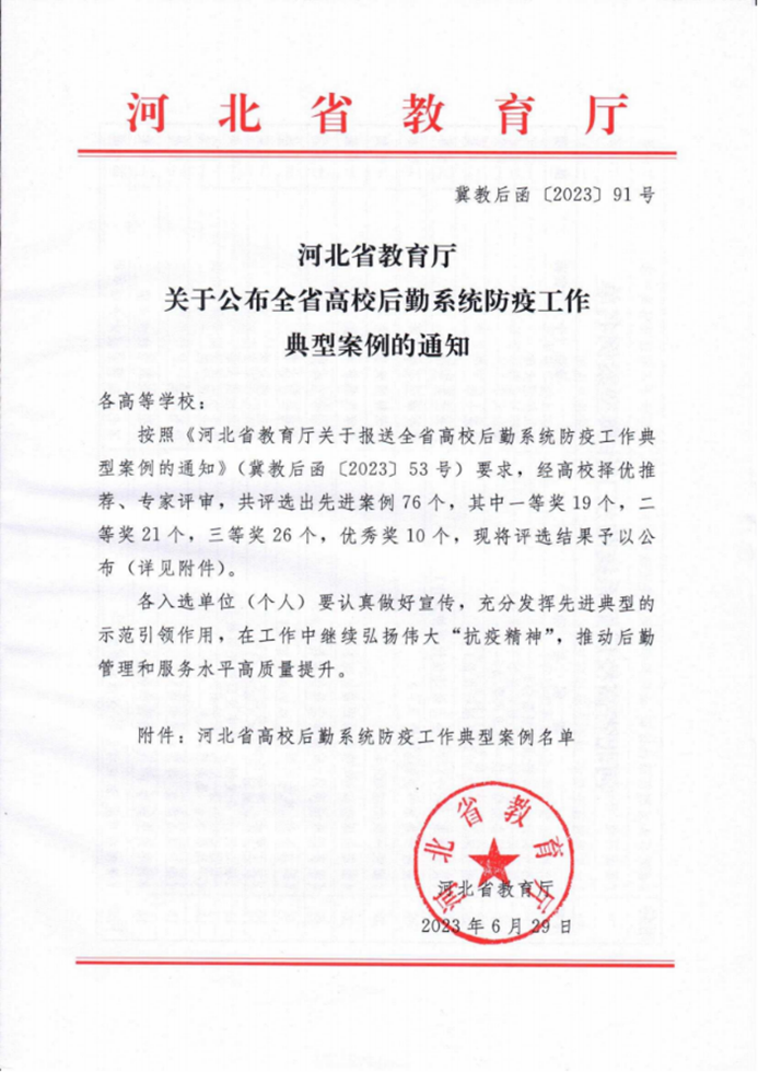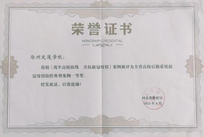 6月29日,河北省教育厅公布了《河北省教育厅关于公布全省高校后勤系统防疫工作典型案例的通知》(冀教后函〔2023〕91号),德赢官网《筑牢高校防线 共抗新冠疫情》荣获一等奖。其中,德赢官网是一等奖获奖高校中的唯一一所民办高校。