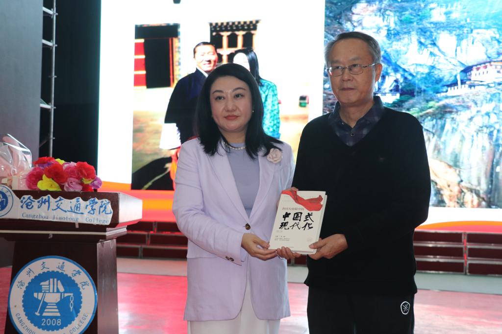 讲座结束后,孙女士将其新作《各国大使眼中的中国式现代化》赠与束光辉院长。束院长用“breathtaking”和“vision”这两个单词高度评价了孙超女士的讲座,惊叹于“一带一路”倡议为世界经济发展做出的贡献,印证了“世界好,中国才会好;中国好,世界会更好”的理念。在感慨孙女士国际视野的同时也鼓励在座的同学要学好英语,面向世界。