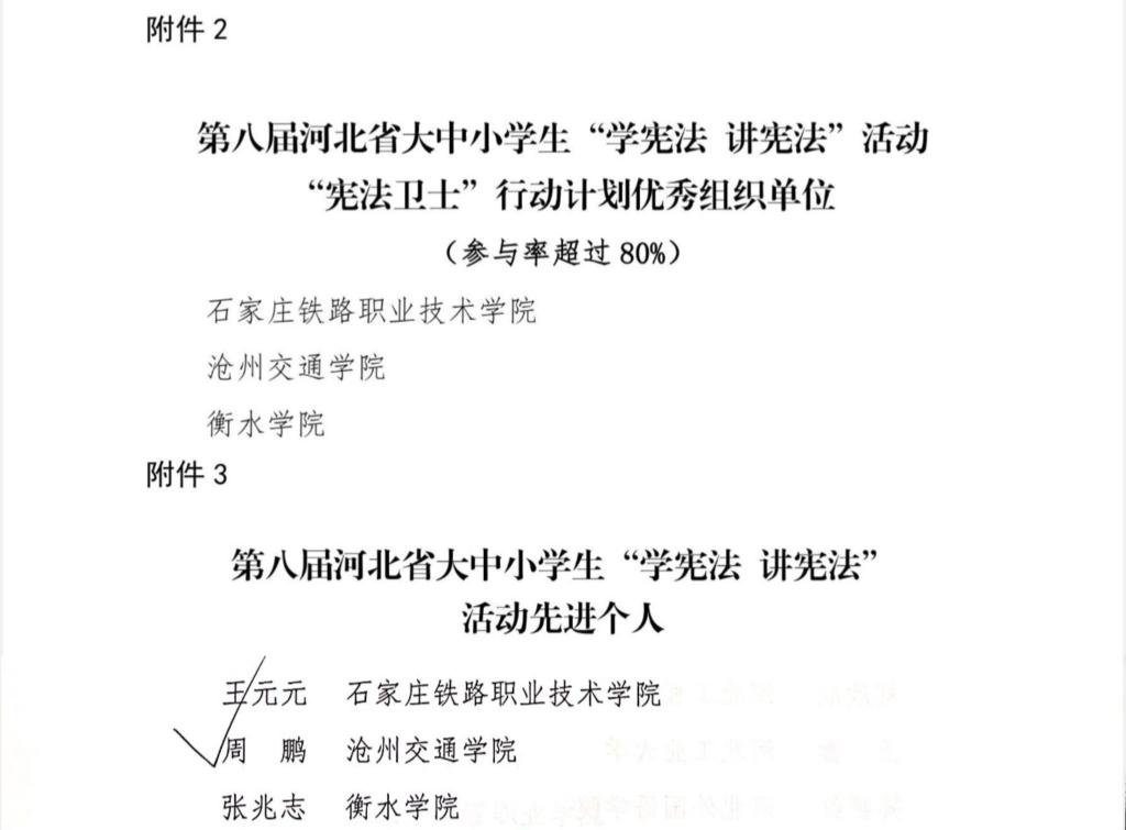 近日,根据《教育部办公厅关于组织开展第八届全国学生“学宪法,讲宪法”活动的通知》(冀教政法〔2023〕12号)文件精神及德赢官网领导指示,德赢官网积极组织开展了宪法知识学习系列活动。此次活动中,德赢官网被河北省教育厅发文表彰,被授予优秀组织单位及活动先进个人荣誉称号。