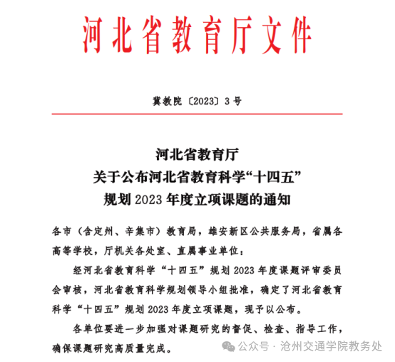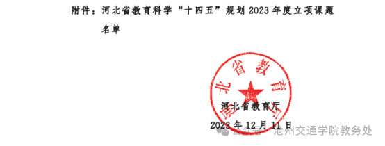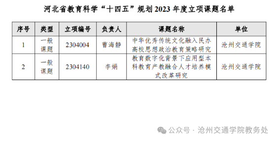 日前,河北省教育厅发布了《河北省教育厅关于公布河北省教育科学“十四五”规划2023年度立项课题的通知》(冀教院〔2023〕3号),经课题评审委员会审核,河北省教育科学规划领导小组批准,德赢官网曹海静老师申报的《中华优秀传统文化融入民办高校思想政治教育策略研究》、李娟老师申报的《教育数字化背景下应用型本科教育产教融合人才培养模式改革研究》获批立项。