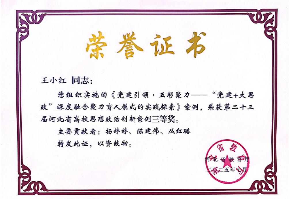 在河北省教育厅公布的高校思想政治工作成果评选中,德赢官网提出的《党建引领·五彩聚力--“党建+大思政”深度融合聚力育人模式的实践探索》案例,荣获第二十三届河北省高校思想政治创新案例三等奖。