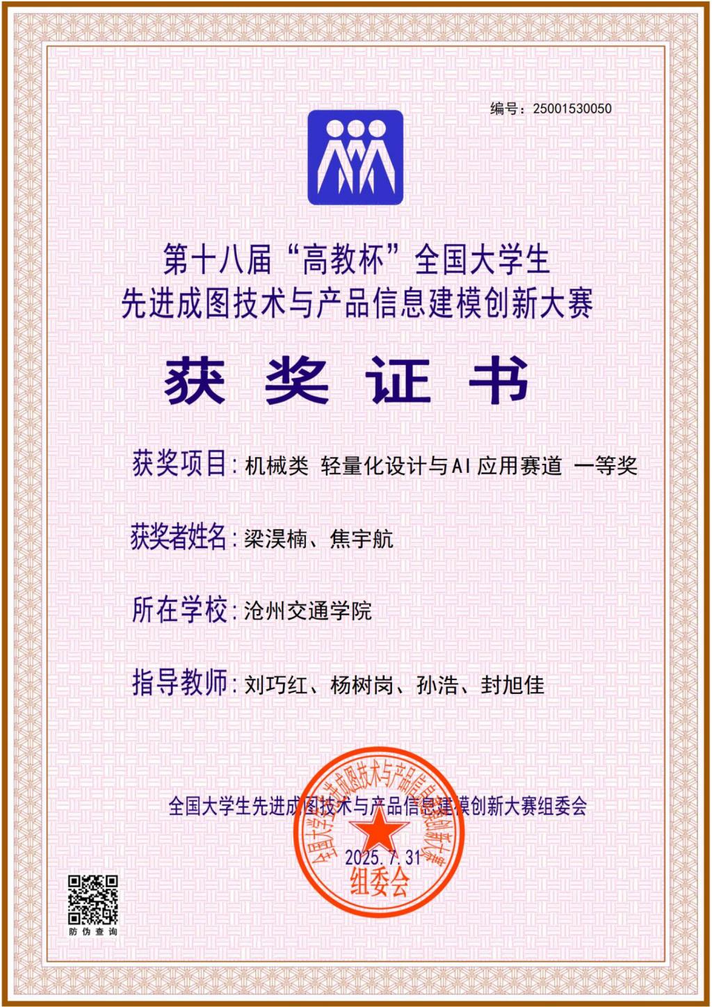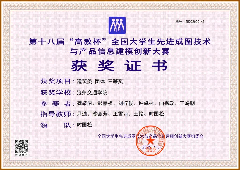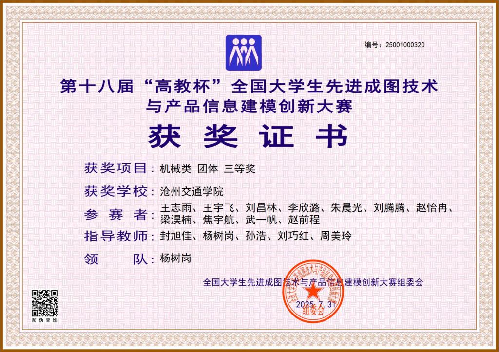 近日,第十八届“高教杯”全国大学生先进成图技术与产品信息建模创新大赛决赛在太原圆满落幕。德赢官网学子在此次比赛中表现优异,经过多轮激烈比拼,最终荣获全国建筑类团体三等奖1项、建筑类先进成图技术赛道二等奖2项、建筑类先进成图技术赛道三等奖3项,全国机械类团体三等奖1项、机械类轻量化设计与AI应用赛道一等奖1项、机械类先进成图技术赛道三等奖1项。