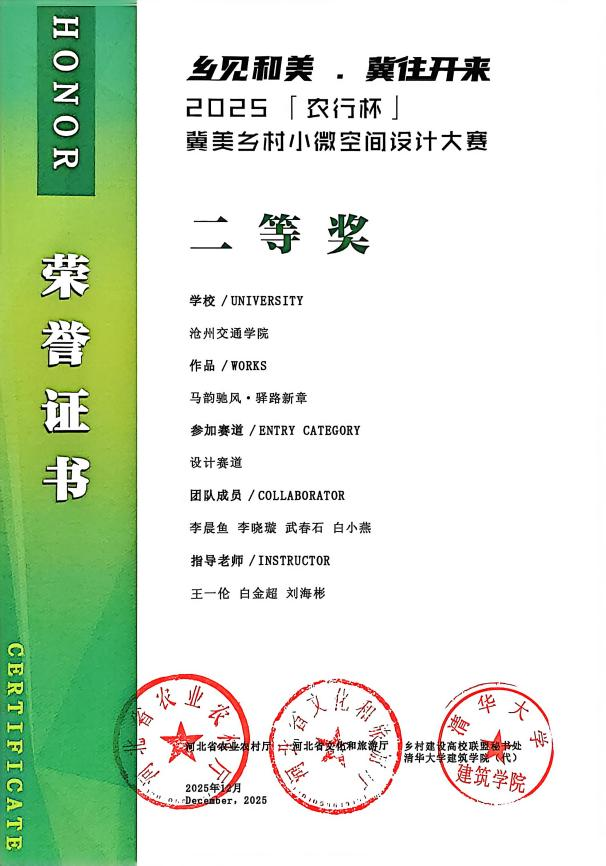 近日,首届2025“农行杯”冀美乡村小微空间设计大赛评选结果正式公布。 德赢官网艺术学院学子在比赛中表现突出,李晨鱼、李晓璇等同学的作品荣获省级二等奖,充分展示了德赢官网在跨学科实践与乡村设计领域的育人成效。