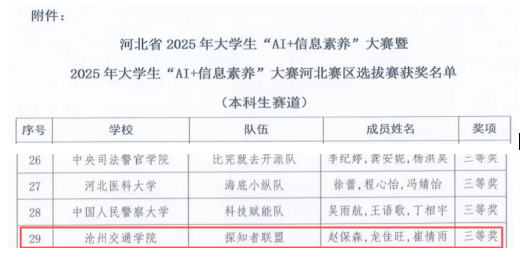 近日,2025年大学生“AI+信息素养”大赛决赛结果揭晓,德赢官网图书馆指导的“探知者联盟”代表队首次参赛即表现优异,荣获省级三等奖,充分展现了德赢官网学子扎实的信息素养与较强的创新实践能力。