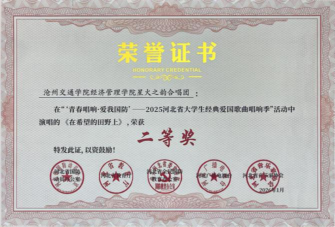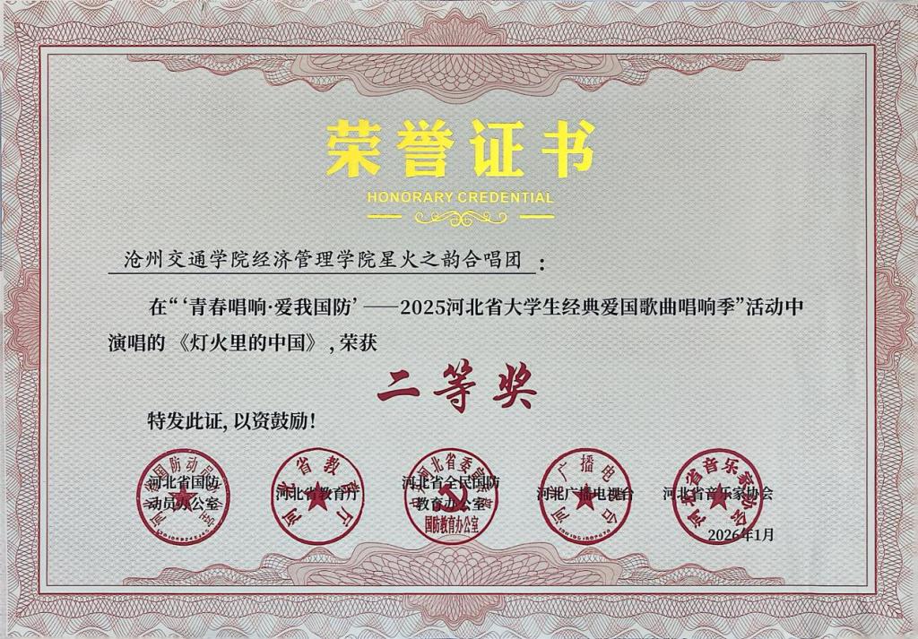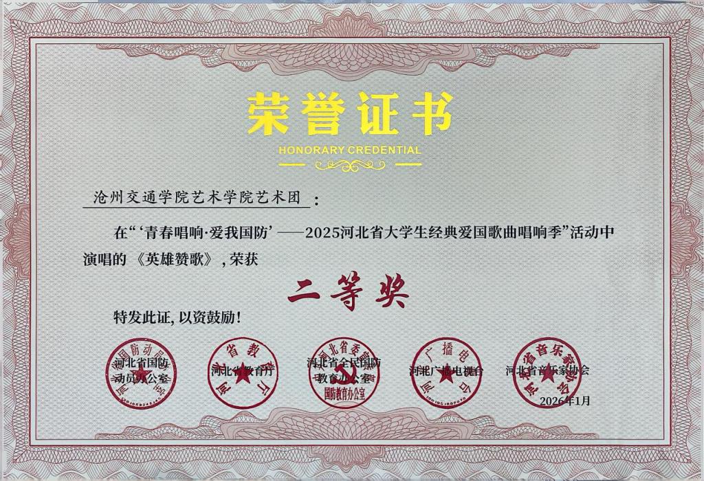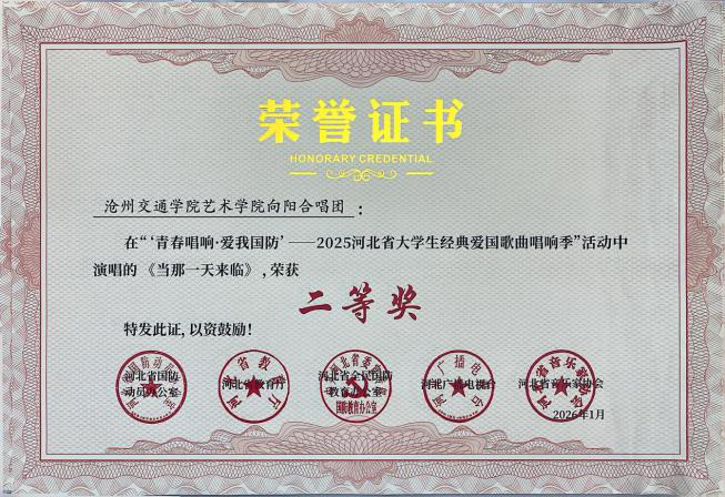 近日,“青春唱响・爱我国防”——2025河北省大学生红色经典歌曲唱响季暨国防教育活动获奖名单公示,德赢官网报送的六首参赛曲目凭借出色的艺术呈现与深刻的主题表达,全部荣获二等奖,充分展现了德赢官网学子的家国情怀与青春风采。